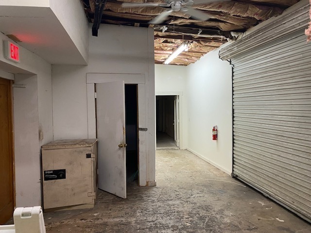 The rear section consists of several rooms and work areas, including a roll-up garage door.