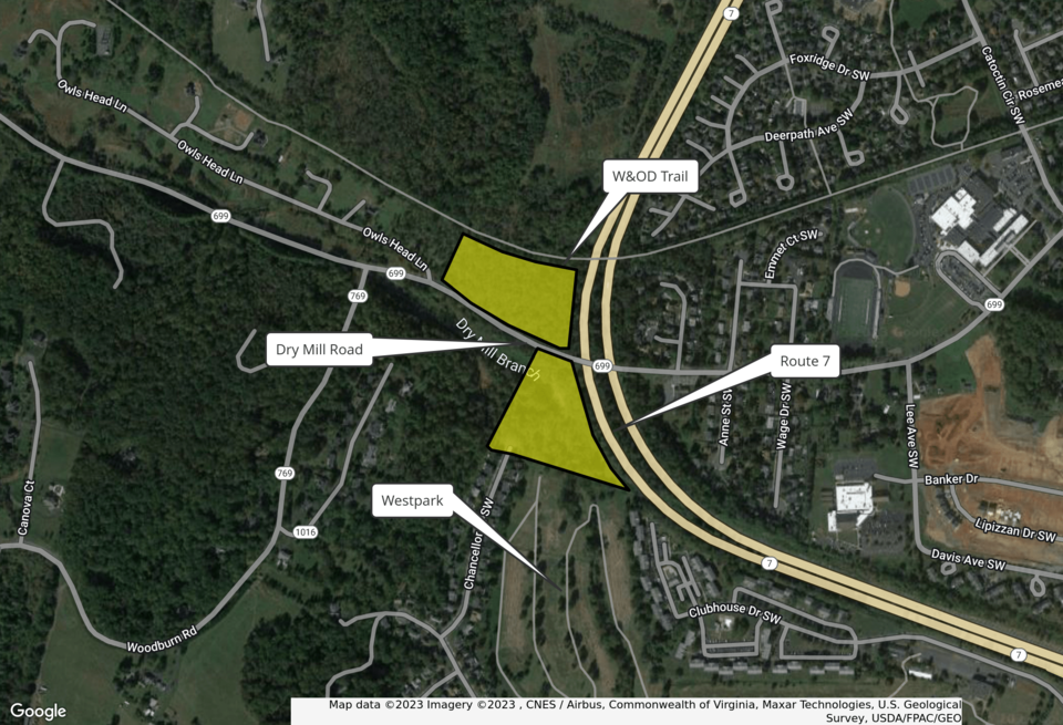 This exceptional property is a rare opportunity to own two parcels of land situated along the popular W&OD Trail in the Town of Leesburg, VA, with access to Dry Mill Road and Route 7. The 14+ acre property is ideally located for a variety of development projects, especially breweries and wineries. The parcels feature a beautiful, tree-lined entrance from Dry Mill Road, which runs through the property, and offers an outstanding investment opportunity for those looking to develop in one of the most sought-after locations in Northern Virginia. With its prime location, ample acreage, and numerous development opportunities, this property is sure to attract a wide range of buyers and investors. Water and Sewer available.