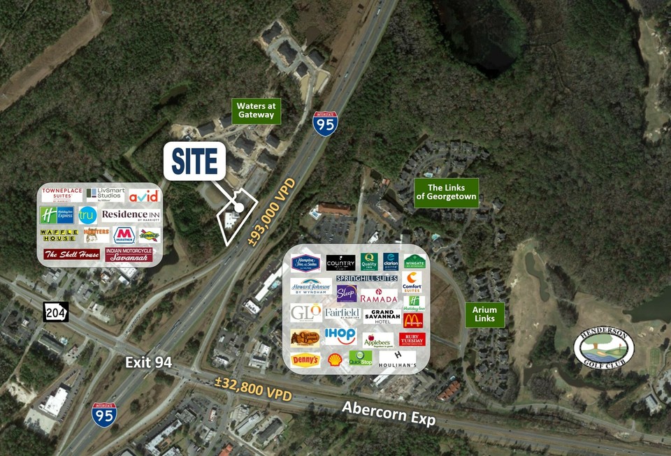 The property is located at Exit 94 of I-95 and GA Highway 204 in Southside Savannah, GA. This interchange, known as Gateway, is the southernmost Savannah exit when traveling on I-95. Traffic counts are ±93,000 vehicles per day on I-95 and ±33,000 on GA Highway 204. Gateway features a dense development of hotels and restaurants in addition to the Henderson Golf Course community and The Links at Georgetown townhomes. As it flows directly downtown, GA Highway 204 becomes Abercorn Street, an extremely heavy retail corridor that experiences traffic counts of up to 57,000 vehicles per day. Abercorn Street connects residents and tourists with 2 regional malls, Hunter Army Air Field, 3 hospitals, established business and residential communities, the Downtown Historic District and easy access to Savannah's islands and beaches. In addition, New Hampstead is located just west of I-95 and will have in excess of 10,000 residential units at completion.