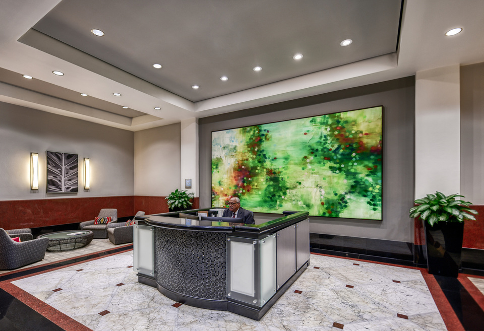 - Class A+ amenities include 24/7 attended security, fitness center, elevated outdoor patio with putting green, restaurants, deli, ATM, dry cleaning service and more.