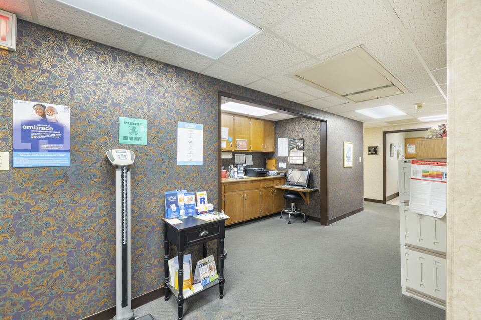 Floor plan includes 6 exam rooms, 3 doctor’s offices, waiting room, reception area, 5 bathrooms, lounge, and extra rooms & storage