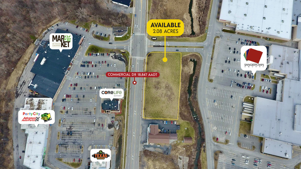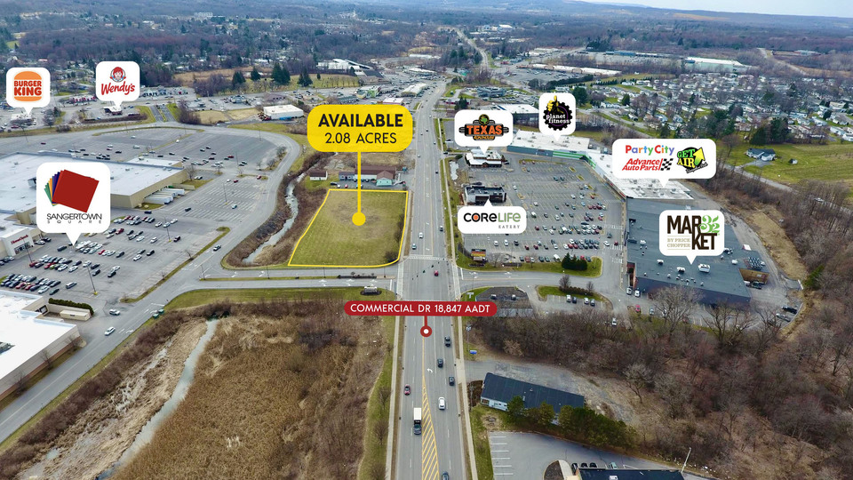 The available site is a grass lot at a signalized intersection & entrance to Sangertown Mall, an 800,000 SF enclosed mall anchored by JC Penney, Macy's, Target, Boscov's, Dick's Sporting Goods, and DSW. Other retail and restaurant development in the immediate area includes: Price Chopper, Hannaford Supermarket, Pep Boys, Verizon, Urban Outfitters, Texas Roadhouse, Red Lobster, Olive Garden, CoreLife, Red Samurai Steakhouse, McDonald's, KFC, Wendy's, Burger King, and Dunkin' Donuts.