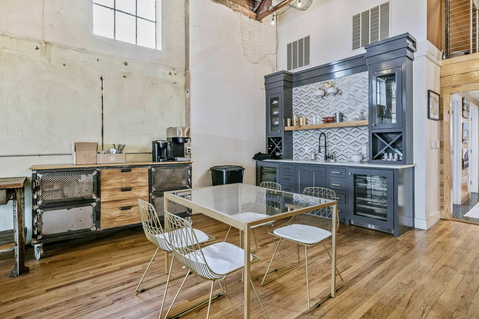 - Features include a classic barrel ceiling, hardwood flooring, wet bar, fireplace, open work spaces, showroom freight elevator