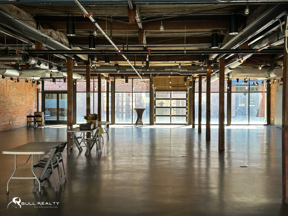 - Expansive open floorplan suited for multiple layouts: Banquet Hall, collaborative office, or full-service restaurant.