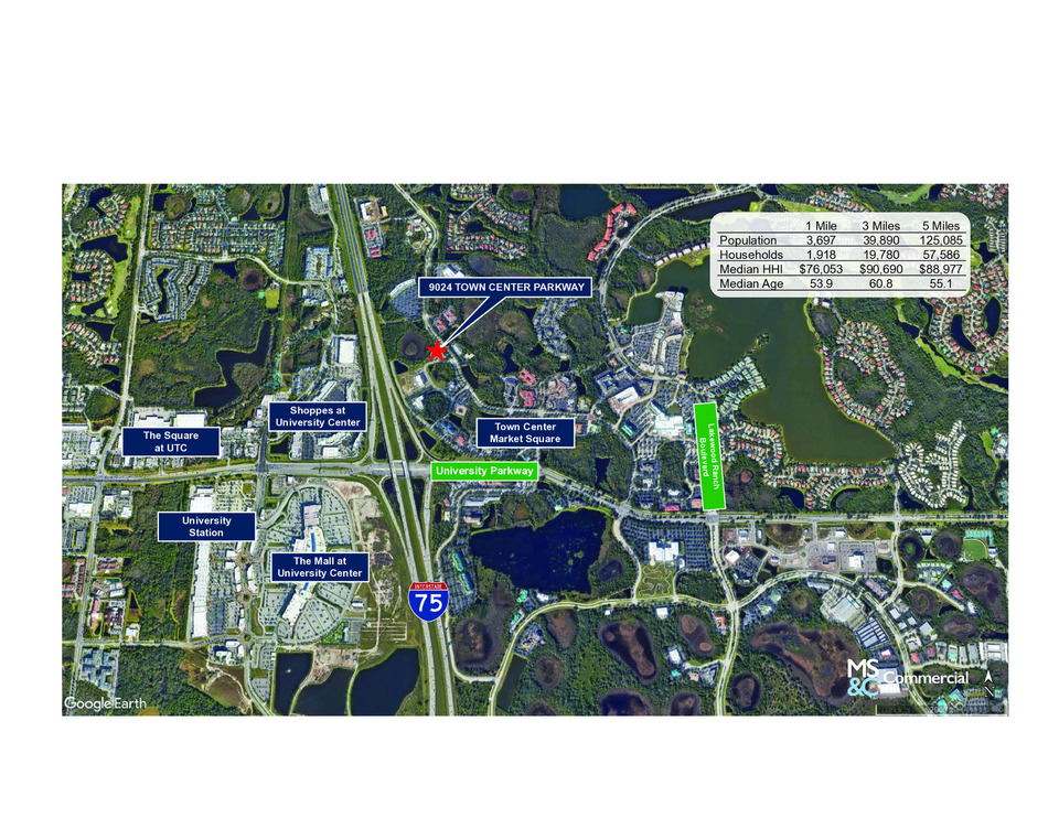 Situated just off Interstate 75, 9024 Town Center Parkway provides excellent visibility and accessibility. It is within minutes of key amenities, including Lakewood Ranch Medical Center, the Mall at University Center, and Shoppes at University Center. Lakewood Ranch is a master-planned community offering a blend of residential, commercial, and recreational spaces.