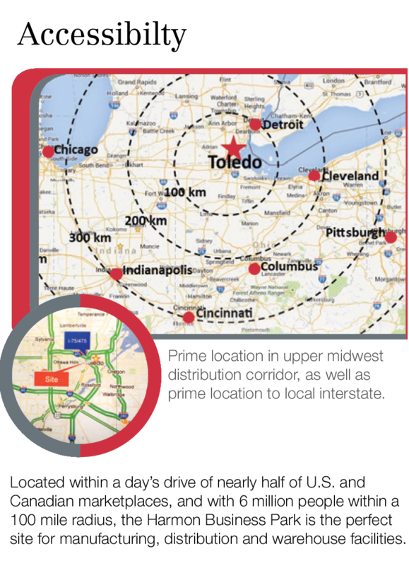 Harmon Business Park is located at the corner of Bass Pro Blvd and Lime City Road in Rossford, Ohio, in the Crossroads Center. The site is logistically perfect as it offers immediate access to I-75, 795 and the 80/90 Turnpike. Harmon Business park is 20 miles from Toledo Express Airport, 45 minutes from Detroit Metro Airport, and minutes from the Maumee River Port. Harmon Business Park is located within 5 hours of 60% of the US and Canadian population.