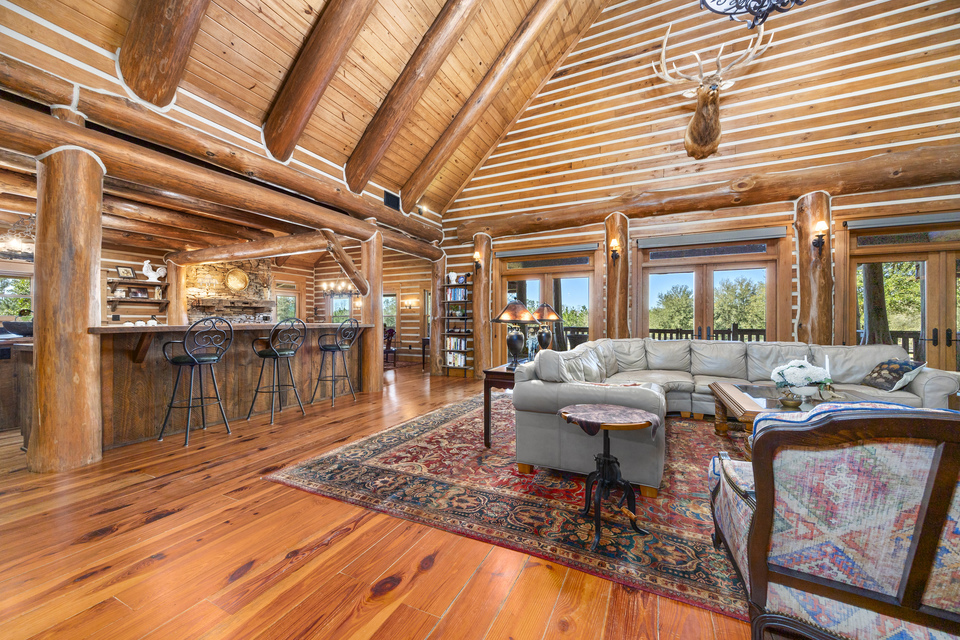 This riverfront property features an expansive, custom log home with luxury finishes, high end appliances and stunning views along the St Marys River. The home boasts 4,114 square feet of living area and another 3,913 square feet of covered porches and parking. The home was constructed in 2008 out of cypress and carries the accent of heart pine throughout the floors and ceilings. The floorplan features three bedrooms, three full bathrooms, a half bathroom as well as an expansive living room and loft. The living area features a large stone fireplace and the dining room features a stone fireplace as well. Both fireplaces are currently gas but they can both be converted to wood burning.