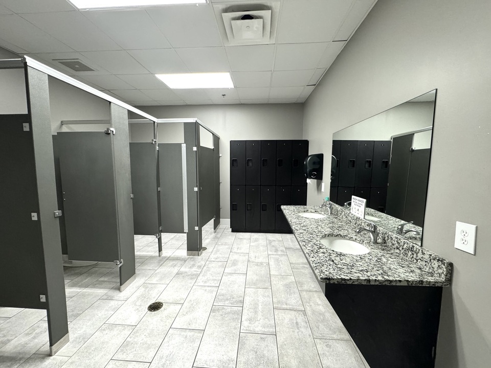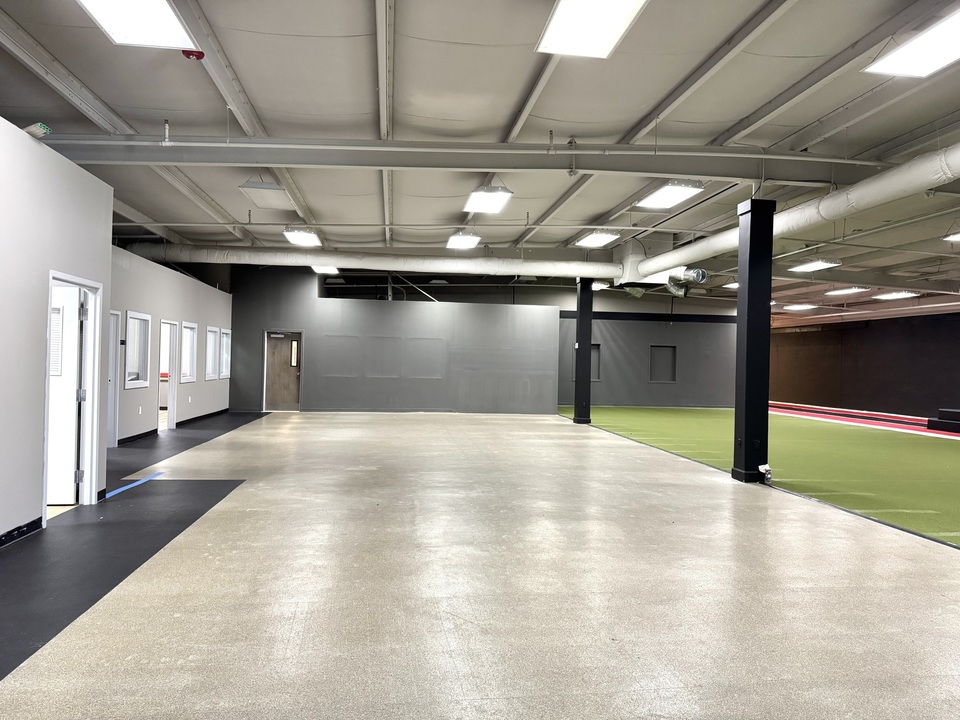 Suite 200 is currently laid out as an athletic training facility. It has a 40-yard dash track, open training areas, a half basketball court, several private rooms, locker rooms that each contain two showers, and a dock-high roll-up door at the back of the suite. There is an additional single-occupant restroom inside an office, which also has a shower. Suite 200 could also be used as flex warehouse space with offices.