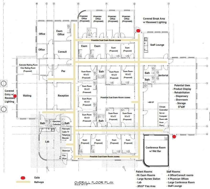 Fully-equipped medical office building ready to meet your needs. With convenient automatic sliding doors at the front entry, 13 exam/procedure rooms, 9 bathrooms, a lab, staff lounge, and ample parking for 81 vehicles, this space offers both functionality and convenience. Building includes a WET Hydraulic Sprinkler System and 800 Amp (277/480Y) volt 3-phase electrical service.