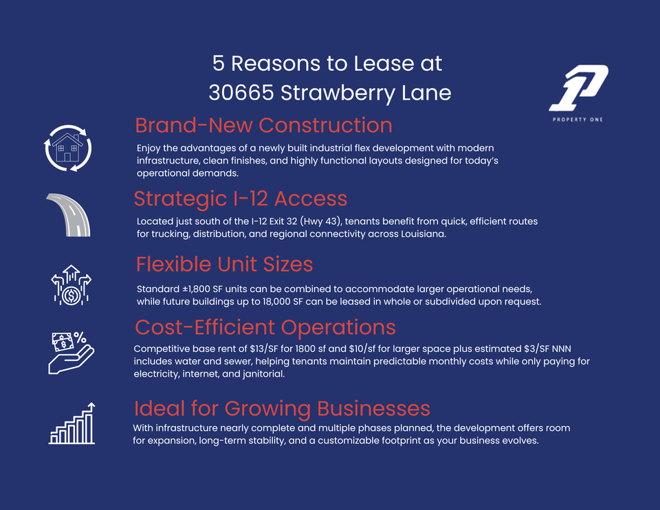 New Industrial Flex space development offering location with easy access from Albany/Springfield I-12 exit number 32. The development is just south of I-12 allowing trucks to take easy routes to facility. Development is located just inside Livingston Parish at the Tangipahoa/Livingston Parish line. Clearing, filling, and infrastructure are nearly complete. 4 buildings to be constructed offering units with approximately 1800 square feet each with 14.8 feet eave height. Units can be combined to fit tenant needs. Several additional buildings up to 18,000 square feet each are planned for the site and can be leased fully or in part upon request. +/-1800 square foot units base rent $13 per square foot plus NNN charges estimated $3.00 per square foot. Water/sewer included in NNN charges. Tenant to pay electricity, internet and janitorial expenses.