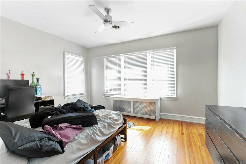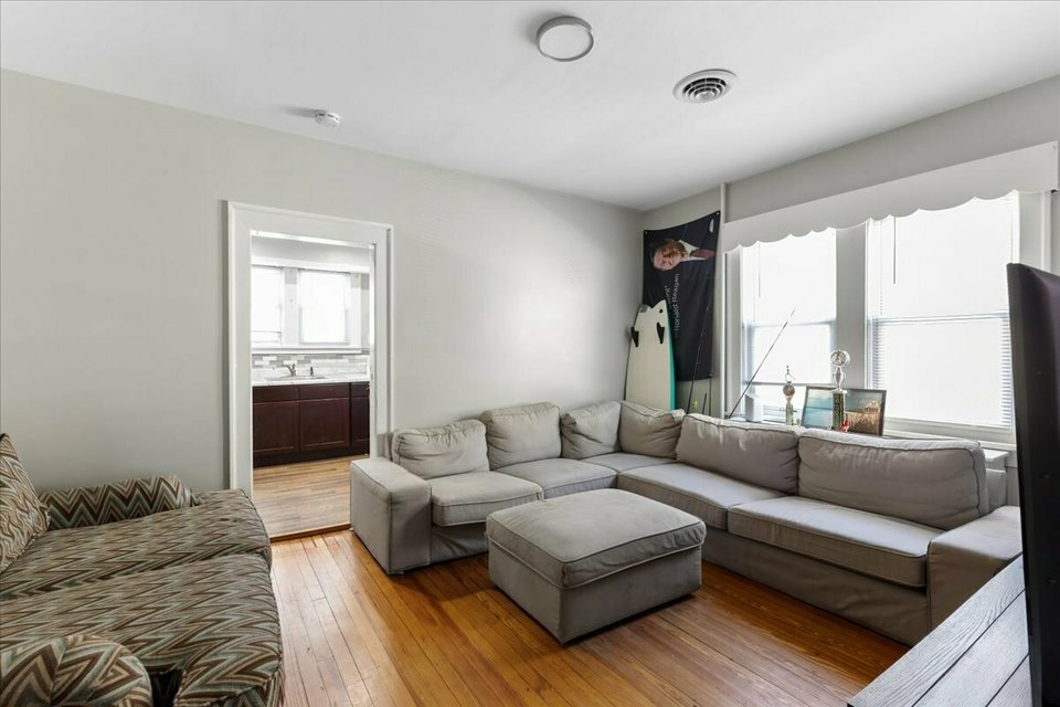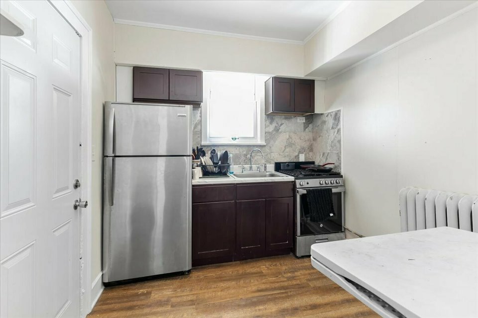 The second floor comprises a three-bedroom, one-bathroom apartment. This unit has been updated with new paint, refinished hardwood floors, a renovated kitchen, and stainless steel appliances. It offers convenient access to nearby shops and public transportation.